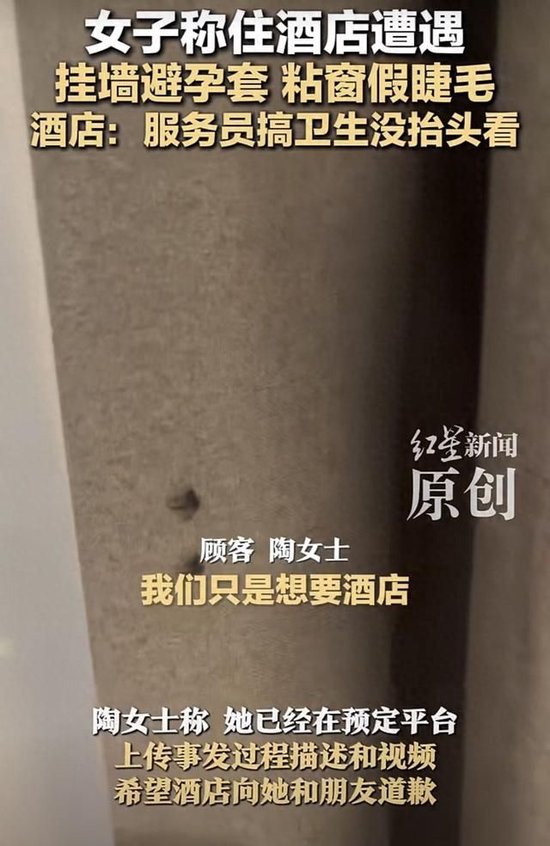 陶女士和闺蜜立即向酒店反映,酒店将她们调至805房间,陶女士称,这个房间的窗帘上粘着一对假睫毛。陶女士称,她已经在预定平台上传事发过程描述和视频,希望酒店向她和朋友道歉。